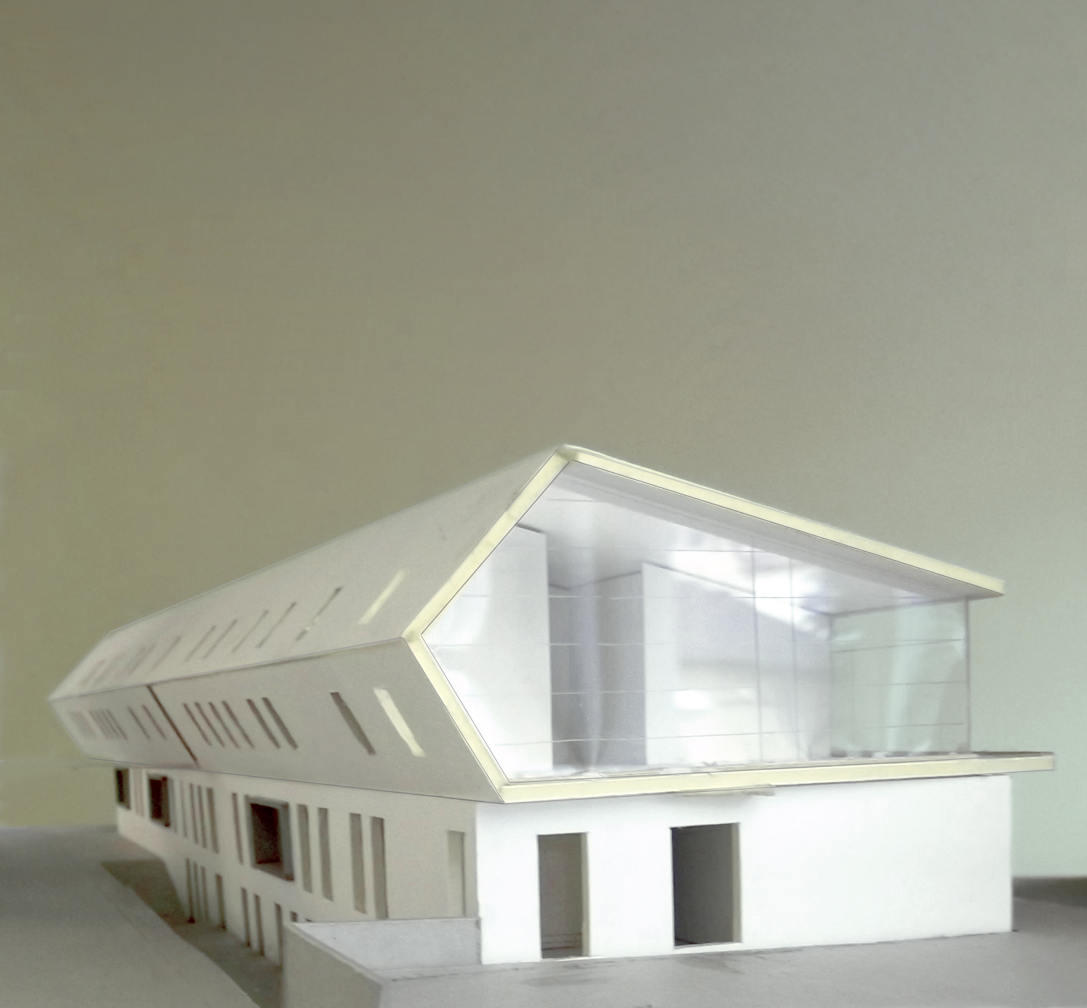 Der Entwurf besticht durch seine prägnante Figur und dem lebendigen Innenraum. Trotz seiner besonderen Form pass sich das gefaltete Dach elegant in die Umgebung mit Satteldächern ein.