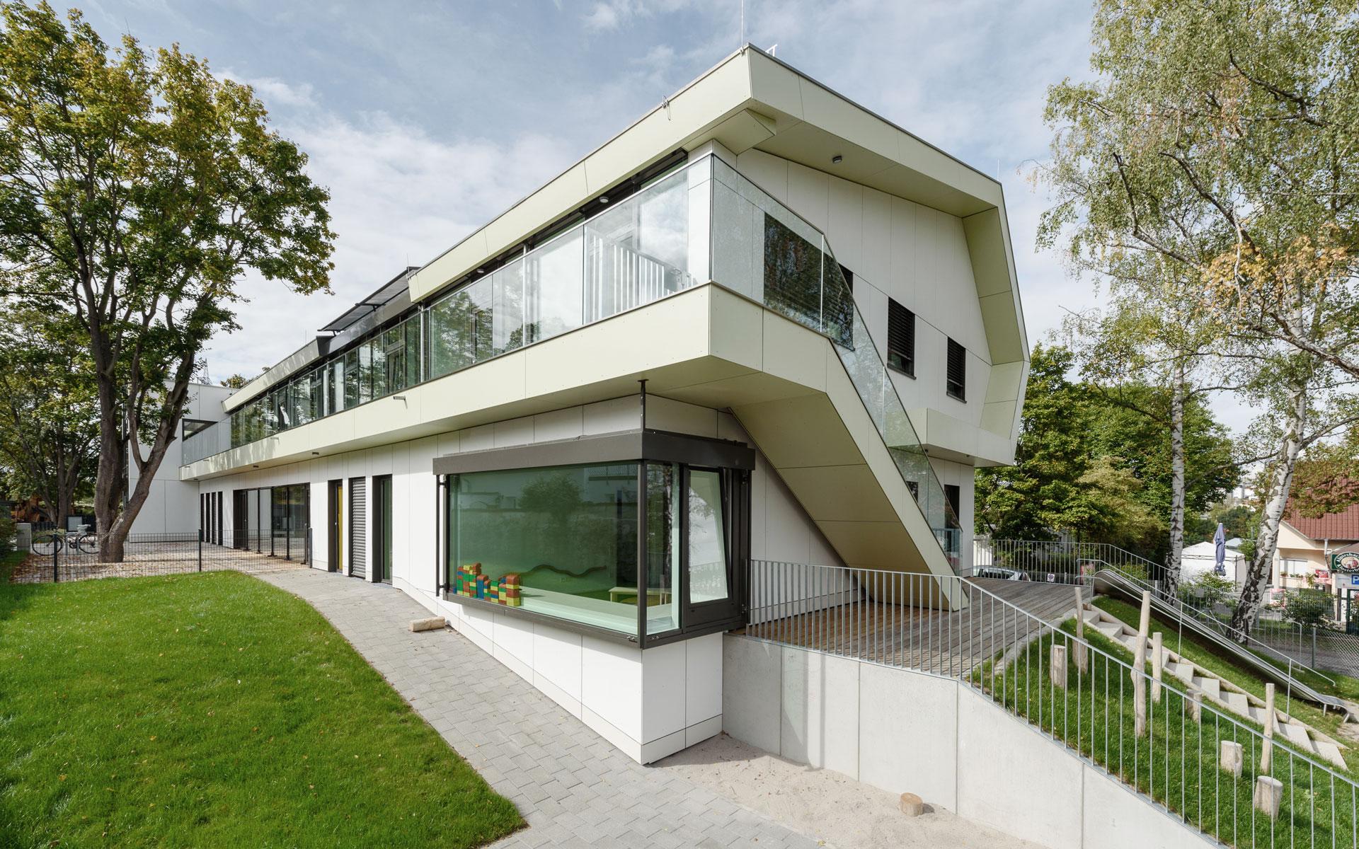 Die Kindertagesstätte in Stuttgart Rot hat aufgrund der ungewöhnlichen Architektur den Wettbewerb gewonnen. Der Grundriss des Entwurfs setzt das Einsteinkonzept konsequent um. Offene und geschlossene Gruppenräume wechseln sich ab und verbinden sich über den Flur zu einem lebendigen Innenraum. Das gefaltete Dach passt sich in die Umgebung mit Satteldächern ein.